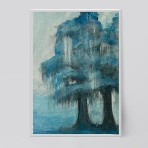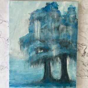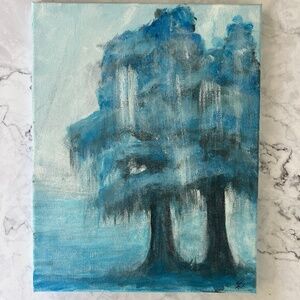 Immerse yourself in the serene beauty of nature with our " Whispering Blue Canopy" acrylic painting. This original artwork, set on an 11x14 canvas, showcases the timeless elegance of cypress trees through an abstract lens. Rendered in soothing blue tones and featuring a unique washed-out effect to resemble moss, this piece brings a sense of tranquility and natural charm to any space.