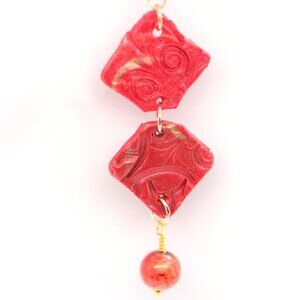 These handmade earrings feature diamond-shaped squares of polymer clay, each 0.5" x 0.5", marbled in rich red-orange and gold tones, then sealed in glossy resin for added shine and durability. Each piece is pressed with an abstract pattern and linked together to create a unique, artistic drop. A foil-lined 8mm red-orange crystal bead dangles from the bottom, catching the light with every movement.
