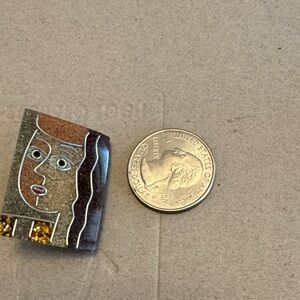Unique abstract face brooch with earthy tones. Features intricate line details and a touch of gold sparkle.
