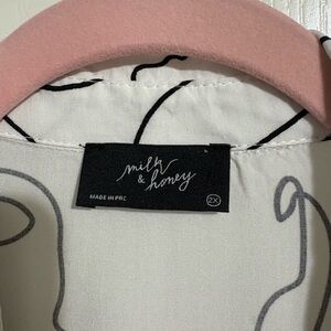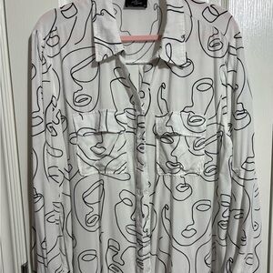 Elevate your style with this chic abstract face print blouse. Perfect for any occasion, this white blouse offers a modern and artistic flair. Pair it with your favorite jeans or skirt for a complete look. Fits more like an XL. Smoke free home.