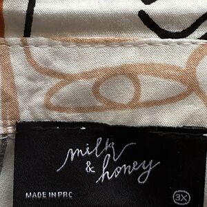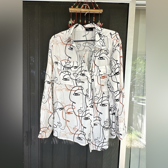 Elevate your style with this chic button-up blouse featuring an abstract face print. Perfect for any occasion.