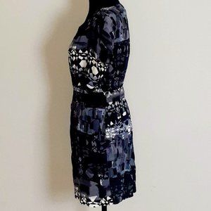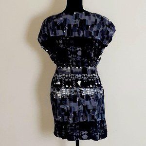 Pre-loved in good condition cap/short sleeve above the knee dress with front pockets, elastic waist band with a fun abstract and geometric print in colors black, white gray and touches of dark blue-gray color, 31" in length, 100% Rayon.