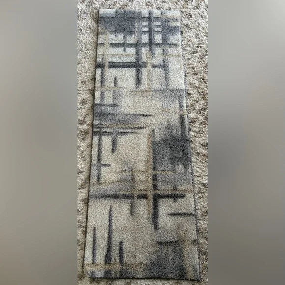 Stylish runner rug with an abstract geometric design. Features shades of gray and cream. 58” x 20”.