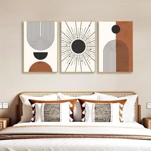 Set of three abstract geometric wall art pieces. Features black, brown, and cream colors. Perfect for modern decor.