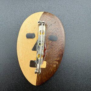 Abstract Handcrafted Wooden Face Mask Brooch Two-Tone Brown & Blonde Wood Design