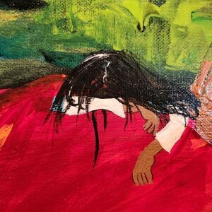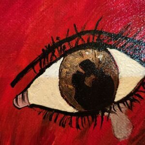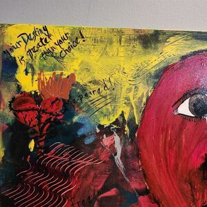Vibrant and colorful abstract broken heart canvas art. Perfect for adding a splash of color to any room. There is so much going on with this piece. There's a bleeding ripped heart, barb wire around a heart, the wolf and the little girl, sadness, etc. Very interesting piece created from a depth of pain.
