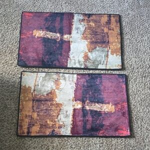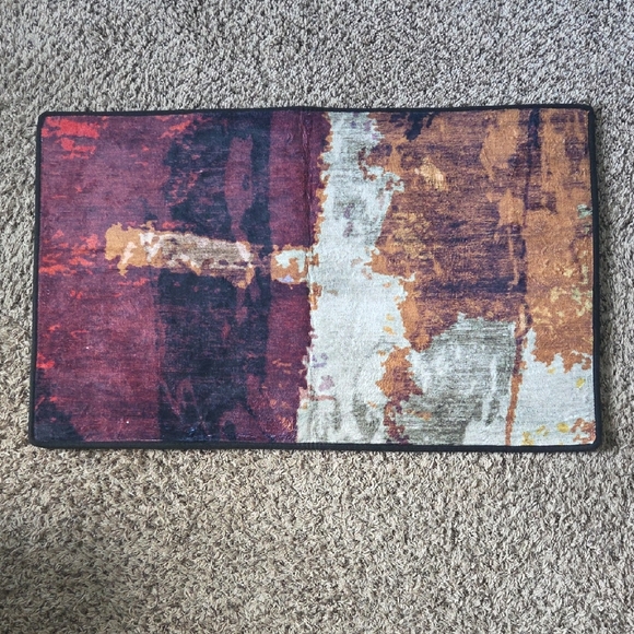 Vibrant abstract area rug with a mix of red, purple, orange, and cream tones. Perfect for adding a pop of color to any room.