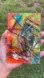 Vibrant abstract art piece featuring a dynamic mix of colors, bobby pins, and glitter. Perfect for adding a splash of creativity to any space.