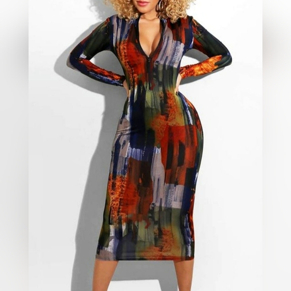 Stand out in this stunning abstract multicolor bodycon dress. Perfect for any occasion, this dress features a blend of vibrant colors that make a bold statement.