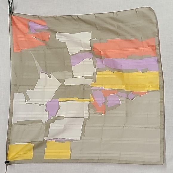 Elevate your style with this elegant silk scarf featuring a blend of gray, yellow, purple, and pink hues. Perfect for adding a touch of sophistication to any outfit.