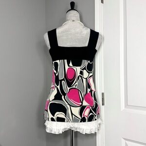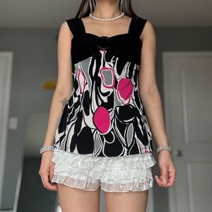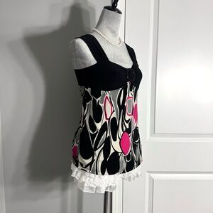 Vintage / retro style funky abstract pattern graphic black and white tank top with hot pink accents, wide straps, and ring detail on front. Material has slight stretch with an empire waist fit.
