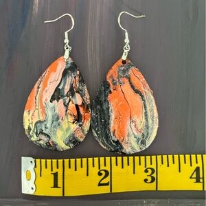 Handmade acrylic dipped earrings, each offering unique abstract marbleized style. These showcase orange and Black mix of colors perfect for fall or Halloween outfits.