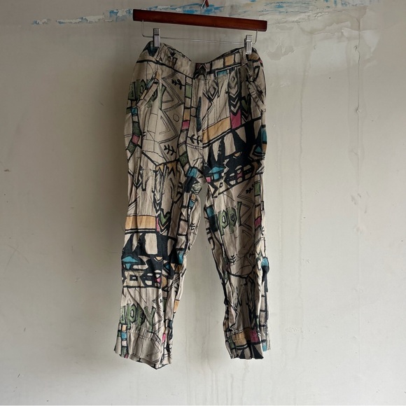 Tan capri pants with funky geometric pattern throughout. Have a stretchy waistband.