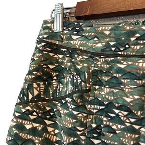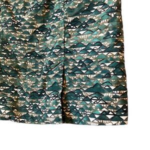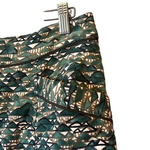 Keywords: pencil skirt, geometric print, abstract pattern, career skirt, business attire, office wear, cocktail skirt, green skirt, brown skirt, cream skirt, professional skirt, women's skirt, dress skirt, lined skirt