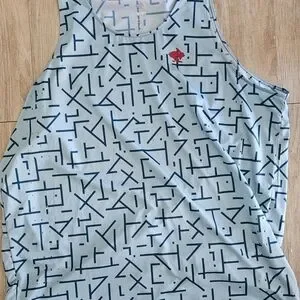 Trendy tank top with an abstract pattern. Features light blue and navy colors.