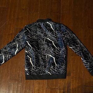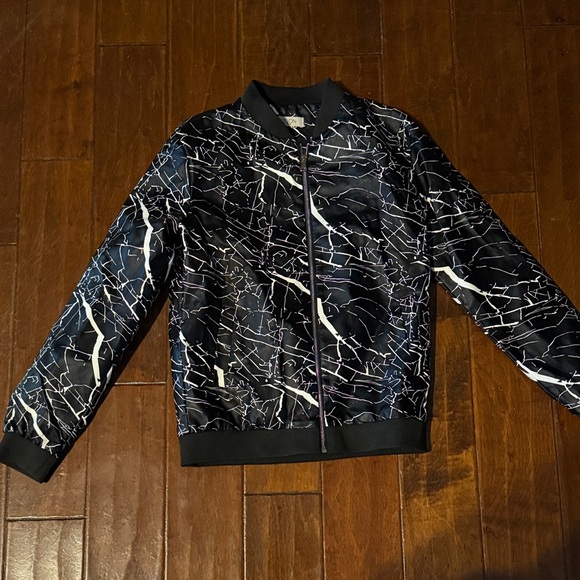 Stylish bomber jacket with an abstract pattern. Features a mix of black and white colors.