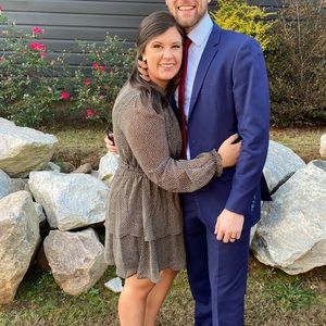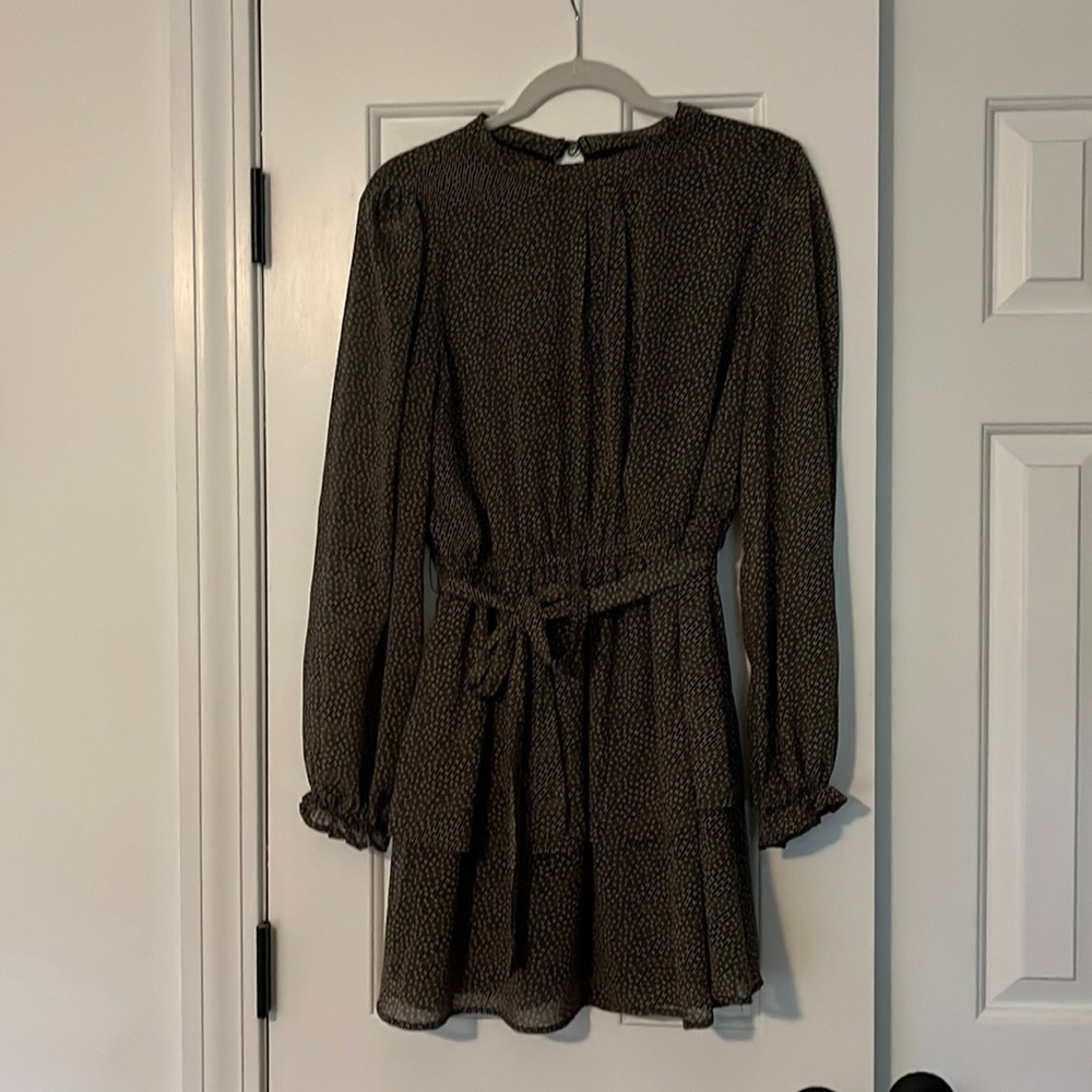Black and brown abstract patterned dress with sheer sleeves, cinched waist, and tie. Brand is Very J size Large