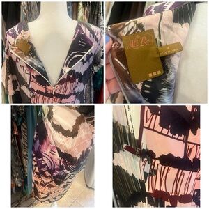 Stylish dress with an abstract pattern in black, pink, and purple.