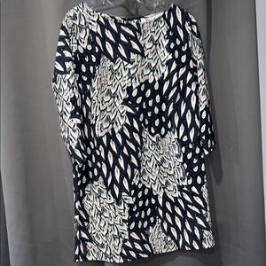 Stylish dress with an abstract pattern. Features a mix of black, white, and pink colors.