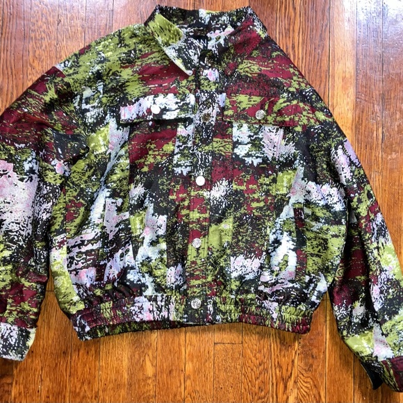 Stylish jacket with an abstract pattern. Features a mix of green, red, and black colors. Perfect for a bold fashion statement.