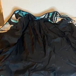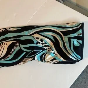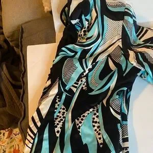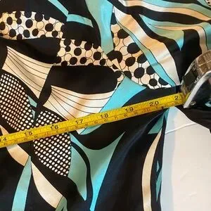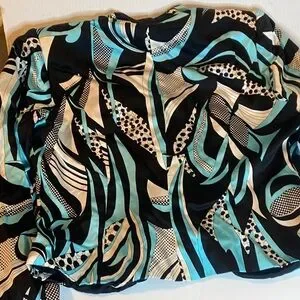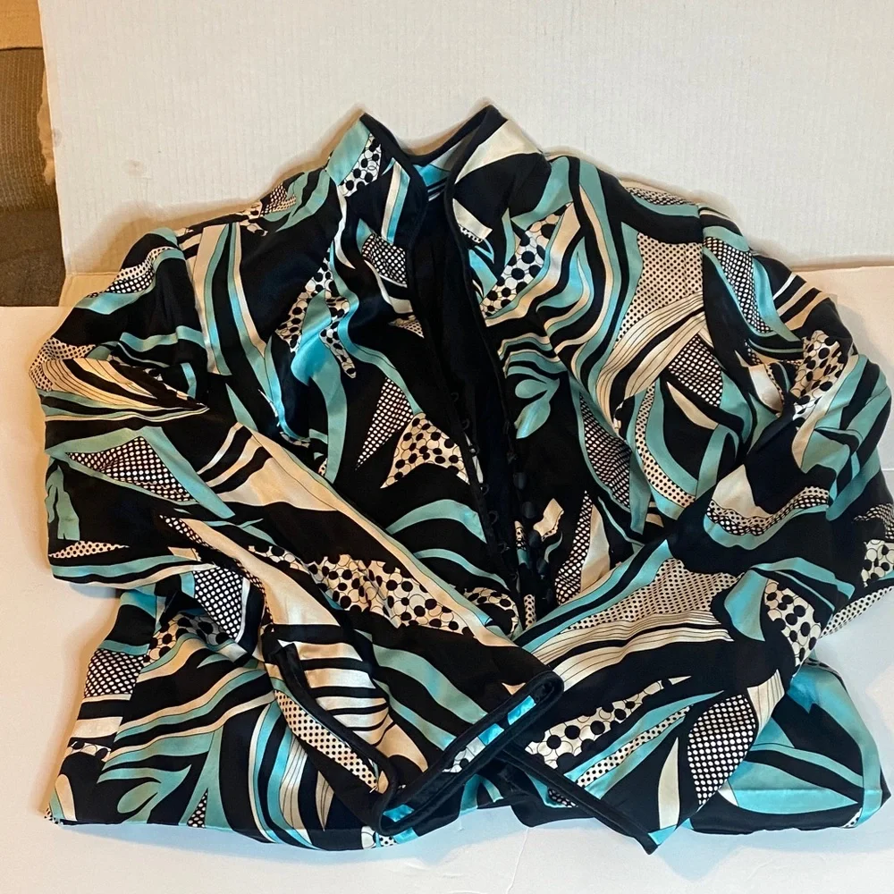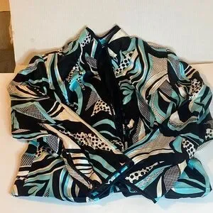 Stylish jacket with an abstract pattern in black, white, and teal.