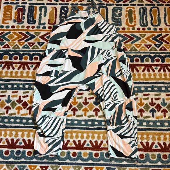 Stylish jumpsuit with an abstract pattern. Features a mix of black, green, and peach colors.