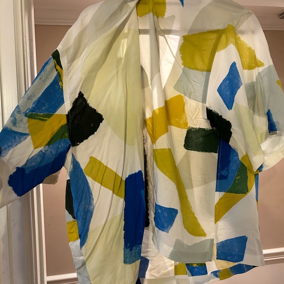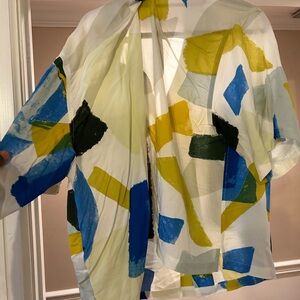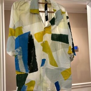 FASHION NOVA Vibrant Button down with abstract patterns. Features blue, yellow, and green colors.
