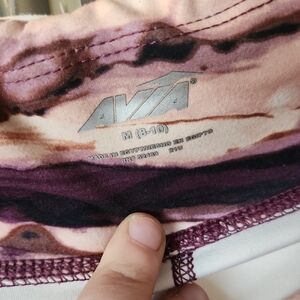 Stylish leggings with an abstract pattern in purple and cream. Perfect for casual wear. has pockets. dri fit fabric.
