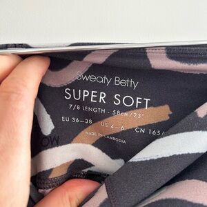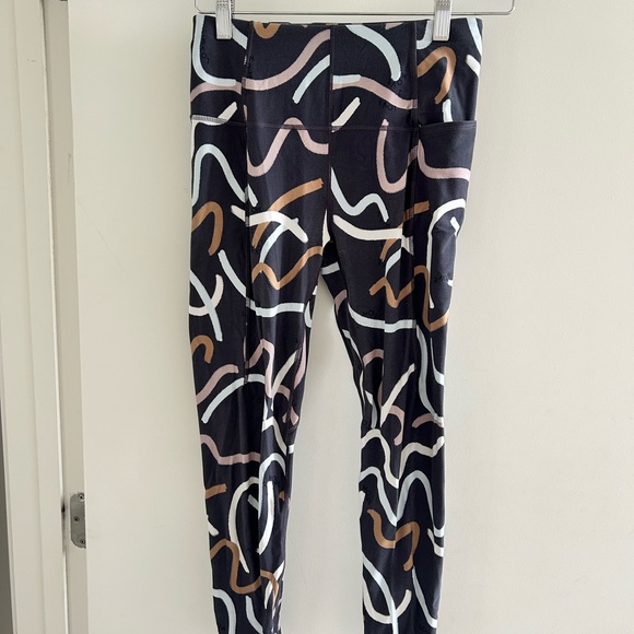 Stylish leggings with an abstract pattern. Features black, white, brown, and pink colors.