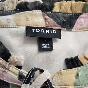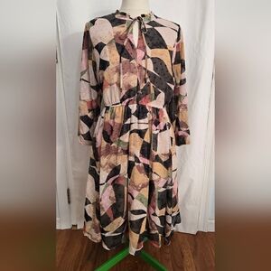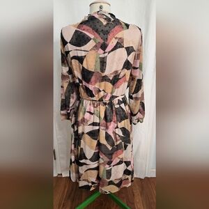 Stylish midi dress with an abstract pattern. Features a mix of colors including black, pink, and green. Perfect for casual outings.