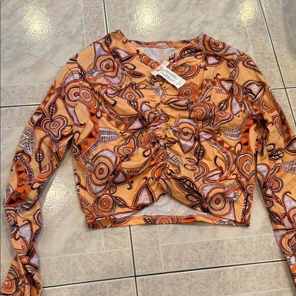 Stylish women's top featuring an abstract pattern in vibrant orange. Perfect for adding a pop of color to your wardrobe. Never worn