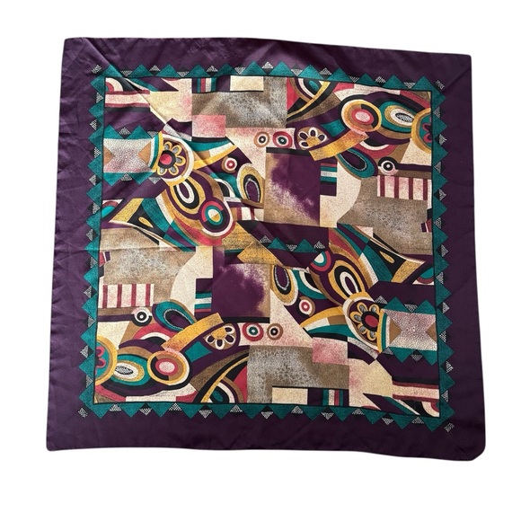 Elegant silk scarf with an abstract pattern. Features rich purple, green, and gold tones. 29 by 29 inches. Tag cut off.