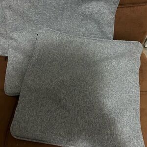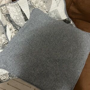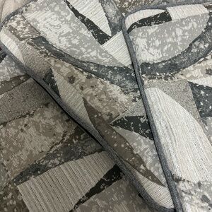 Set of abstract patterned throw pillows in gray and cream tones. Perfect for adding a modern touch to your decor.