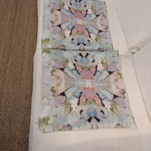 Set of two throw pillows with an abstract pattern. Features a mix of pastel colors. Covers only