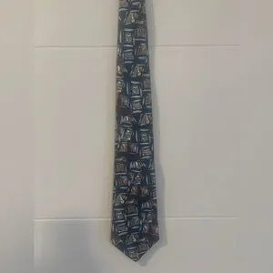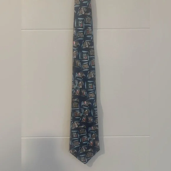 Stylish tie with an abstract pattern. Features shades of blue, red, and brown.