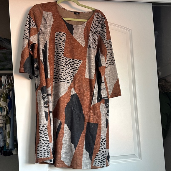 Stylish tunic dress with an abstract pattern. Features a mix of brown, black, and gray colors. Perfect for casual outings. Cute styled with a pair of boots, sandals or sneakers. Versatile!