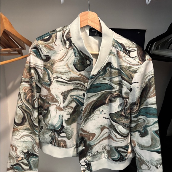 Elevate your style with this abstract patterned jacket. Featuring a unique blend of cream, brown, and green colors, this jacket is perfect for making a statement. Ideal for casual outings or adding a touch of flair to your wardrobe.