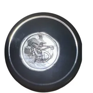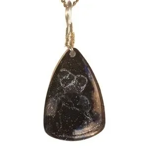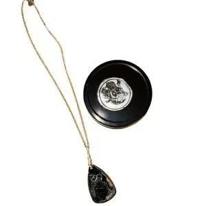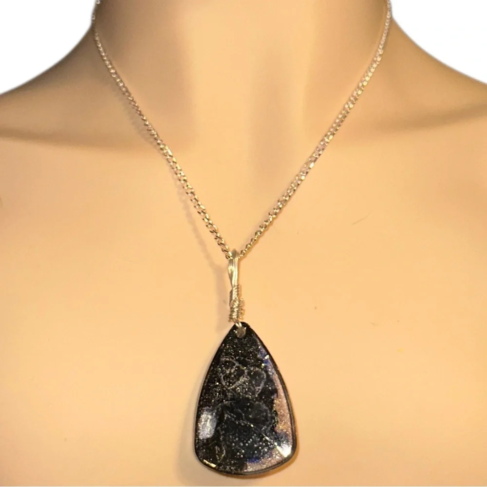 Hand designed epoxy pendant in black, white & silver with a hint of blue on 2.0 mm silver tone 18” chain w/ lobster claw clasp & Pamynthia Designs & Made in America charm. Ships in hand designed Pamynthia Designs tin.