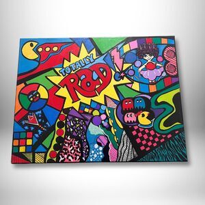 This painting is Totally Rad—its not just a painting but also for your home entertainment! It can be used as a trivia game by guessing which 80s games are included in the piece. This painting is part of Frankie’s Decade Series. It represents some of the hottest games of the 80s. It’s bold, bright, and meant to bring you joy.