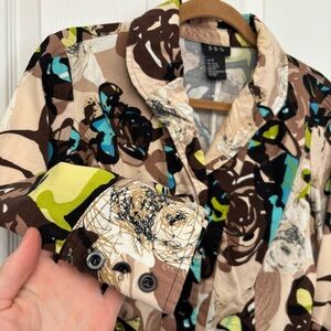 Unique cropped jacket with a bold abstract print featuring earthy browns, black, turquoise, and chartreuse tones. The structured cotton fabric and artistic pattern make it a standout layering piece that adds personality to simple outfits.
