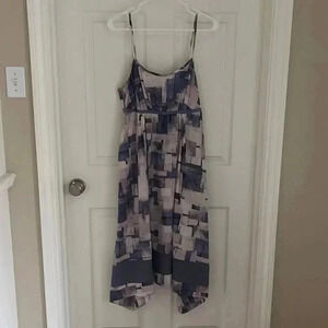 Keywords: abstract print dress, midi dress, flowy summer dress, boho chic, casual chic, asymmetrical hem dress, spaghetti strap dress, versatile dress