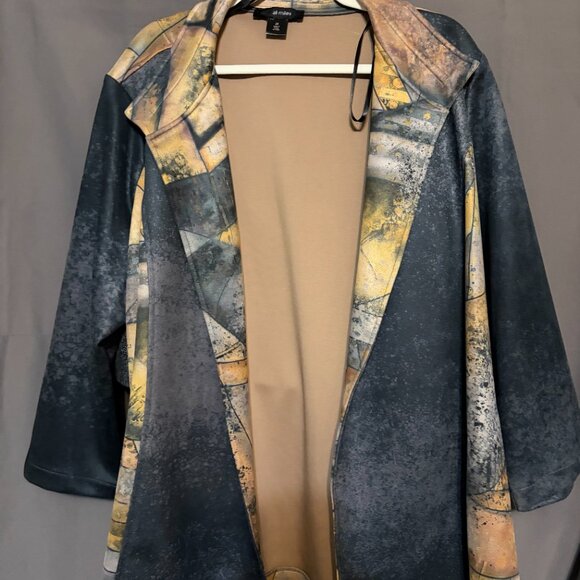 Unique abstract print open-front cardigan by Ali Miles, features a fluid drape, soft stretch fabric and a neutral palette of charcoal, taupe and muted gold tones./Perfect statement layer for casual chic outfits, gallery looks, or elevated everyday wear.