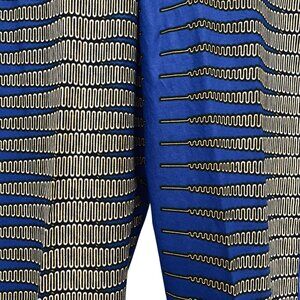 Make a statement with these bold blue and gold abstract print pants, featuring a unique geometric squiggle pattern with a mid-century modern feel. These mid-rise trousers are tailored with a tapered leg and subtle darts for a flattering silhouette. The structured waistband and side pockets provide a polished yet funky finish, ideal for anyone looking to add retro flair to their wardrobe.