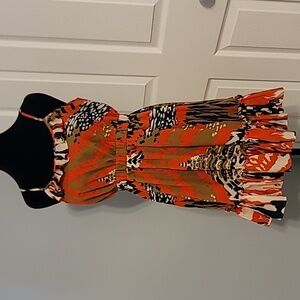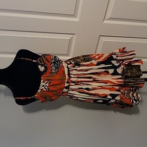 Vibrant sleeveless dress with ruffle details. Features a mix of colors orange🧡, blue💙, and brown🤎 patterns. Perfect for a bold look that demans attention! 🫡 COSMOPOLITAN Hot Pick Item 🔥