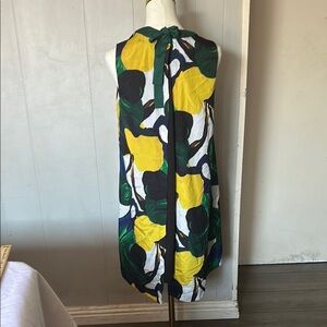 Make a statement with this sleeveless mini dress featuring a vibrant abstract print. The bold green, blue, and yellow colors add a lively touch to your wardrobe.