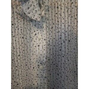 Vintage black & white, long sleeve blouse, in size Medium. Has an abstract all over print, with a sheer striped background. Has a tie neckline, with an attached pussycat bow. Front is button down closure with white plastic buttons. The sleeves are bishop style, with ruffle detail at the cuff, as well as a button closure. Size tag has been removed, so size is based on measurements. Please take note of them below.