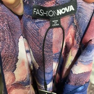 Elegant dress with abstract patterns and ruffle details. Perfect for any occasion.