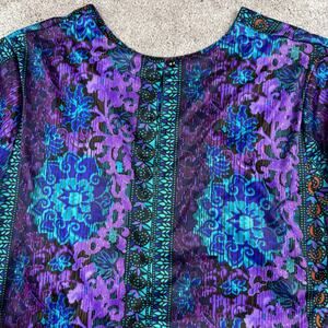Abstract Short Sleeve Blouse Size XL Purple Green Slinky Floral Moody Office