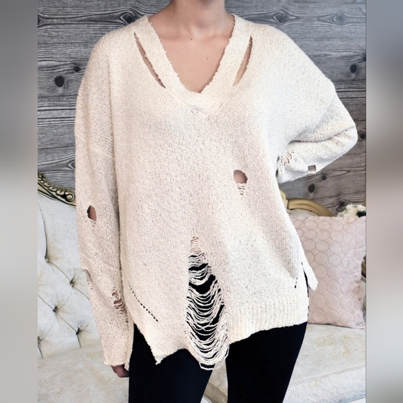 You have to have this trendy distressed sweater. It is so soft. There are so many cute details from the cutout vneck to the side splits to the on point distressing. It's also longer in back for more coverage. 81% Polyester 19% Acrylic