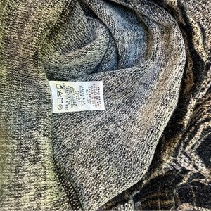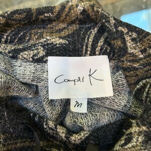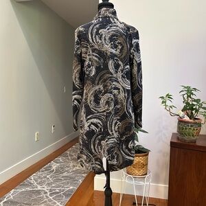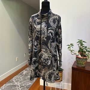 Stylish tunic with abstract swirl pattern. Features a mix of black, gray, and white colors.